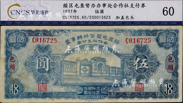 民国二十六年(1937年)绥区屯垦督办办事处合作社支付券伍圆,包头地名,乃晋军王靖国部发行之军用钞票;少见,八成新