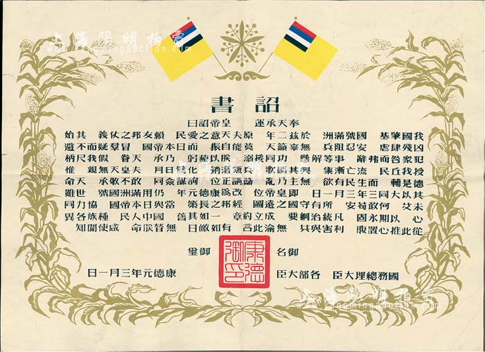 康德元年(1934年)伪满洲国建国·诏书一张,八成新