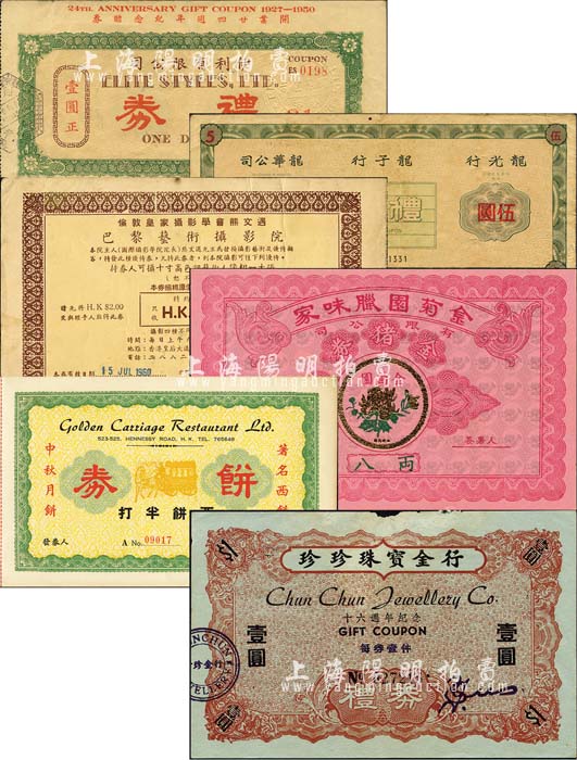 香港礼券等6种,详分:1950年伊利有限公司礼券壹圆;1960年巴黎艺术摄影院优惠券港币伍圆;1961年龙光行·龙子行·龙华公司礼券伍圆;1965年珍珍珠宝金行礼券壹圆;金菊园腊味家有限公司金猪券八两;金马车大饭店饼券西饼半打;森本勇先生藏品,七五至九成新