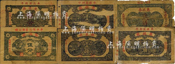 牟平县民间钞票6种,详分:东盛泰1934年贰角;聚昶号1934年壹角、贰角;东顺兴1937年伍分;龙盛园1937年伍分;振东号1937年壹角;森本勇先生藏品,其中1枚背有贴补,五至七成新
