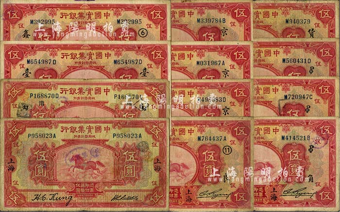 中国实业银行伍圆券共12枚不同,上海地名,详分:1924年伍圆无加字、加印领券“6·滃·沟”共2种;1931年伍圆加印领券“台”、“⑥·鑫”、“11·良”、“京·Le”、“京·镇”、“京·东益”、“PO·角”、“PO·顺”、“PO·松·天”、“货·MB”共10种;七至七五成新
