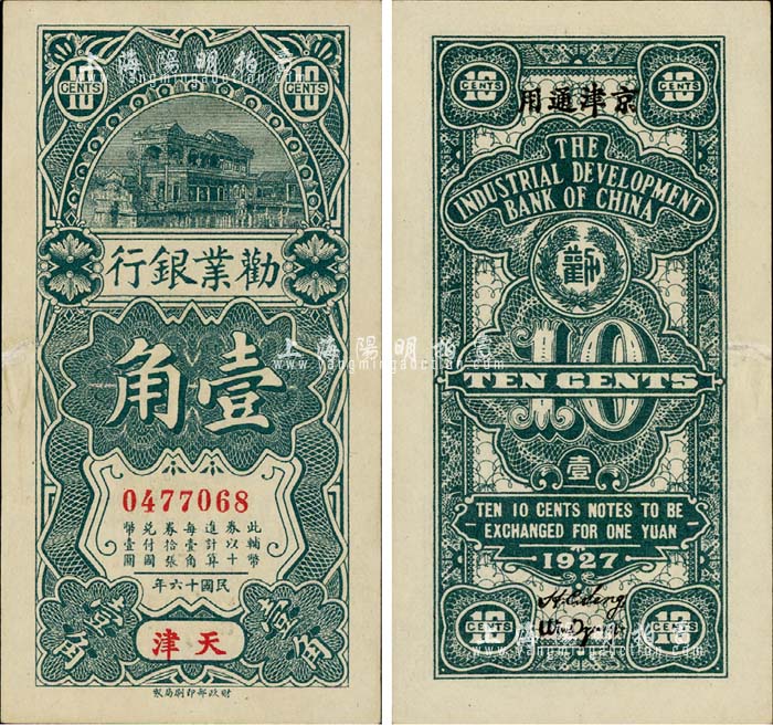 民国十六年(1927年)劝业银行壹角,天津地名,背印“京津通用”,流通票略少见,边有一处小裂口,未折九成新