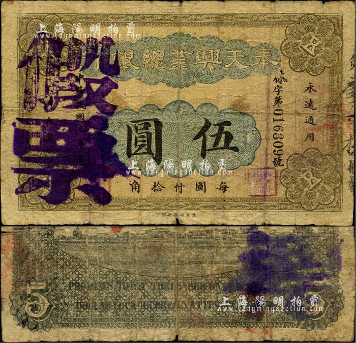 民国二年(1913年)奉天兴业总银行北洋版伍圆,上盖“假票”戳记,乃属历史同时期之老假票;罕见,近七成新
