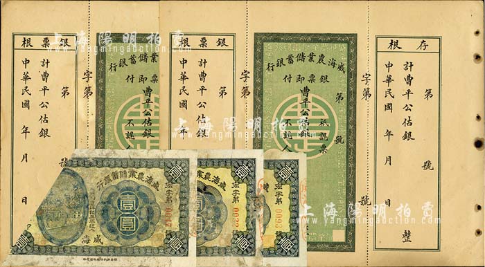 民国初年·威海农业储蓄银行纸币共5枚,详分:曹平公估银未填用银票2枚,附带有存根和票根,背印行楼图;1916年鹰洋壹圆3枚,威海地名,裁角回收票;五至八五成新