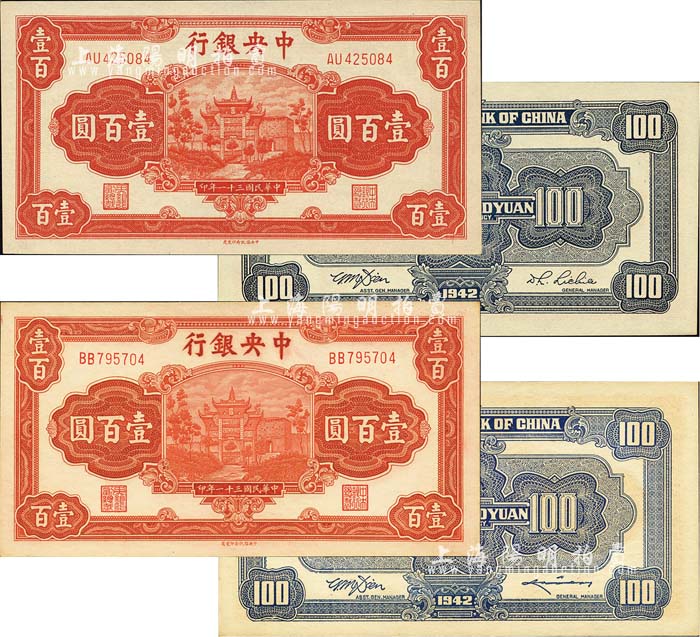 民国三十一年(1942年)中央银行信托版壹百圆共2种不同,分别为李觉·田亦民签名和李骏耀·田亦民签名;海外藏家出品,九八至全新