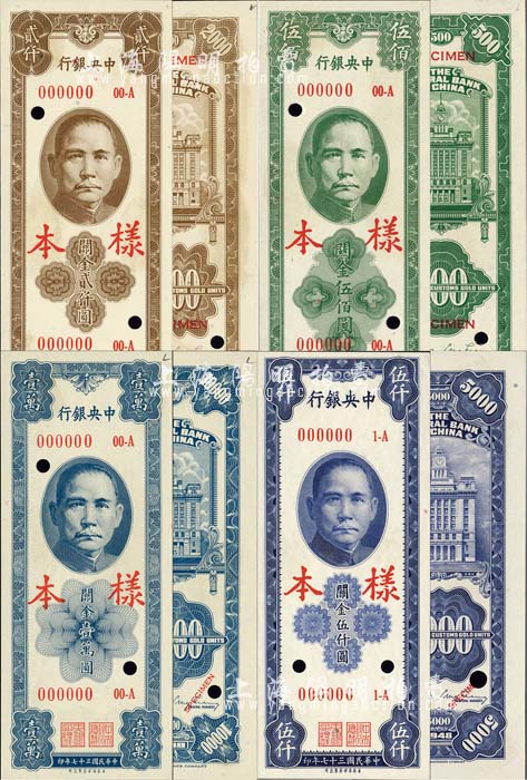 中央银行关金保安版1947年伍佰圆、贰仟圆、1948年伍仟圆、壹万圆样本券共4种全套,正背共8枚,且背面均有档案编号;美国藏家出品,成套者甚为难得,九六至全新