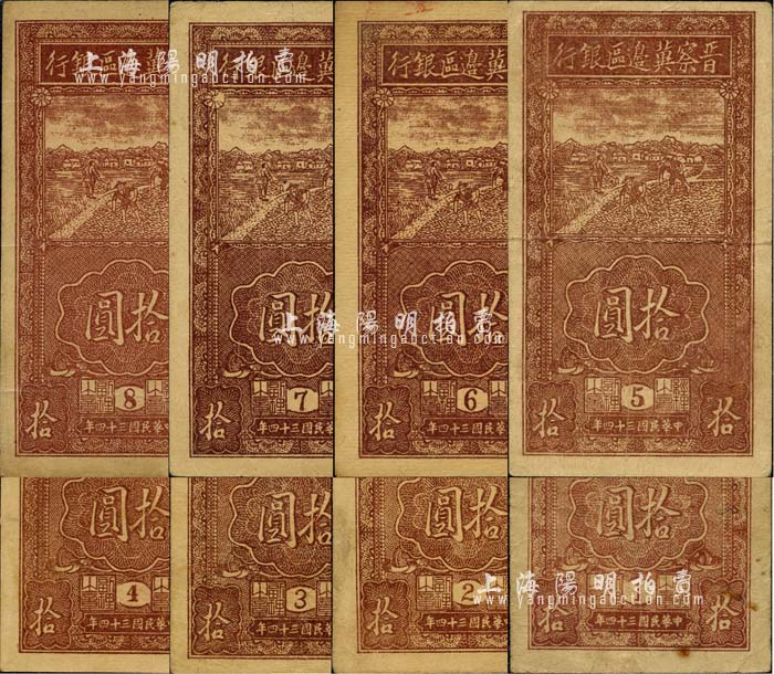 民国三十四年(1945年)晋察冀边区银行竖式拾圆共8枚全套,分别各印1、2、3、4、5、6、7、8版铭,能集全八种者殊为不易,值得重视;除1枚边有小损七成新外,其余约八至九成新,敬请预览