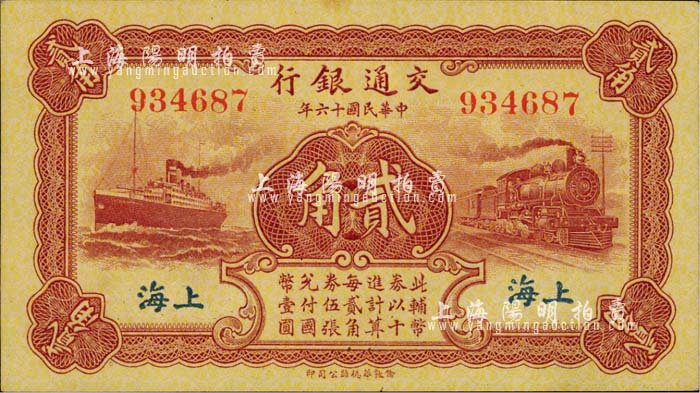 民国十六年(1927年)交通银行棕色贰角,上海地名,无字轨,背印梁士诒·胡孟嘉签名;台湾明德堂藏品,九八成新