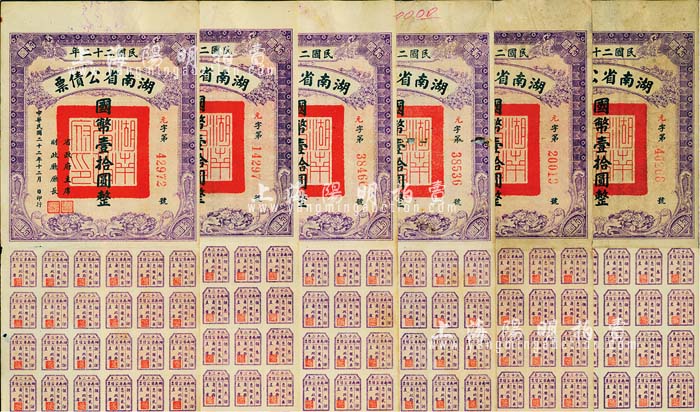 民国二十二年湖南省公债票国币壹拾圆共6枚,均附带有息票,八成新