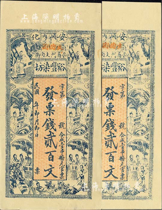 民国年(安化)裕丰染坊贰百文共2枚,分别为厚纸版和薄纸版,上印红楼梦人物图;欧洲藏家出品,少见,九五成新