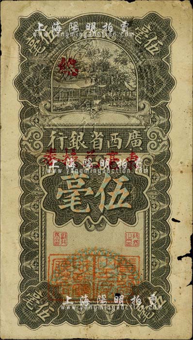 民国十七年(1928年)广西省银行伍毫,加盖“东毫兑换券”,并有“省政府主席”和“财政厅厅长”二职章,属少见版式;有小破损,七成新