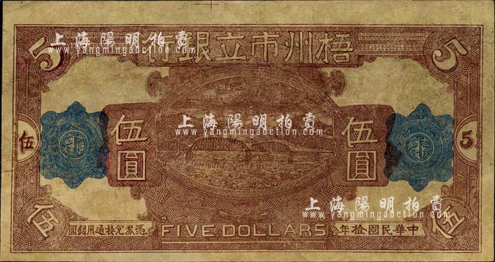 民国拾年(1921年)梧州市立银行单面试印票伍圆,背面尚印有部分花纹,有修补,七五成新