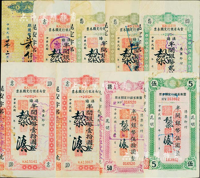 民国三十八年(1949年)云南省银行定额本票共8枚,详分:昆明地名半开银币伍圆、伍拾圆;无地名版滇铸半开银币壹拾圆3枚、贰拾圆3枚;七至八五成新(另附送:中国侨民银公司昆明储蓄部本票1枚,面额期国币贰仟万元)