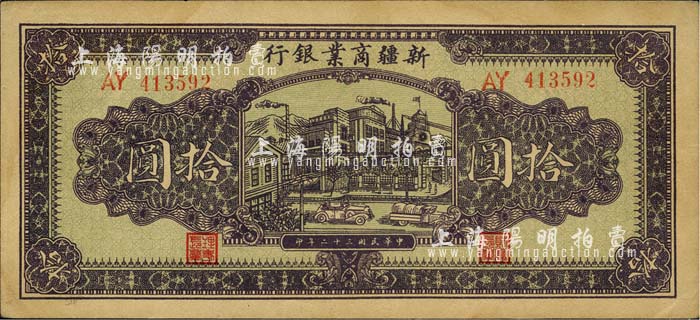 民国三十二年(1943年)新疆商业银行拾圆,背印彭吉元(“新疆王”盛世才妹夫)中英文签名;前辈藏家出品,有黄斑,中未折九成新
