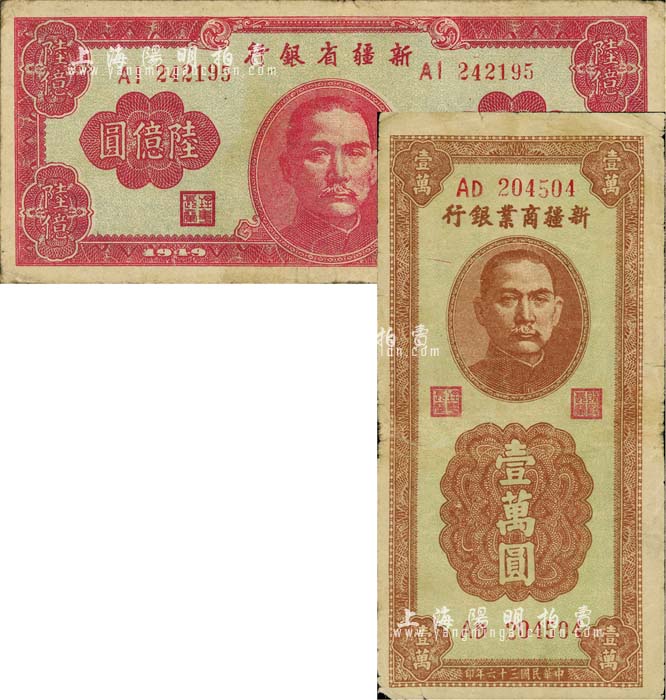 新疆纸币2种,详分:新疆商业银行1947年壹万圆、新疆省银行1949年陆亿圆;前辈藏家出品,七至八成新