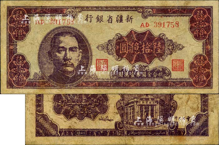 1949年新疆省银行陆拾亿圆,中国最大面额纸币,有修补,七成新