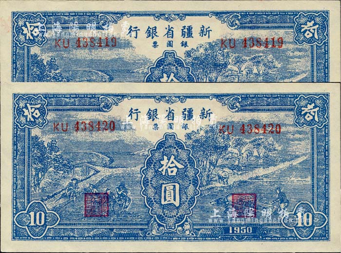 1950年新疆省银行银圆票蓝色耕种图拾圆共2枚连号,前辈藏家出品,品相上佳,九八成新