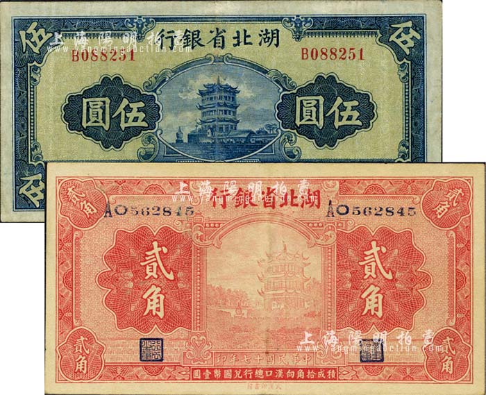 湖北省银行1928年贰角、1941年伍圆共2枚不同,八至九成新