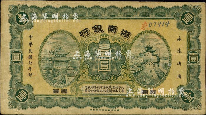 民国七年(1918年)湖南银行壹圆,发行于护法战争时期,史称“永州新银行”,少见,近八成新