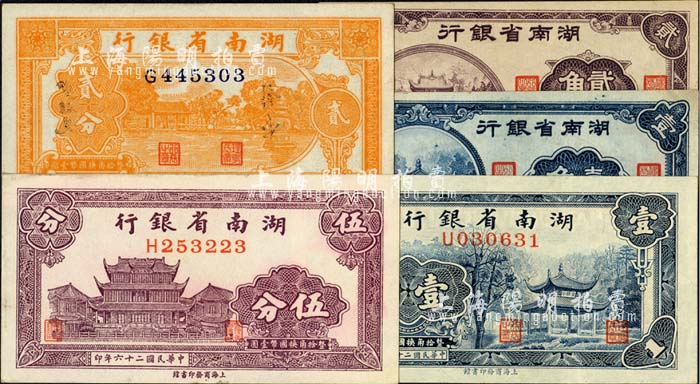 湖南省银行纸币5种,详分:1937年伍分,1938年贰分、壹角,1940年壹角、贰角,未折九五至九八成新,敬请预览