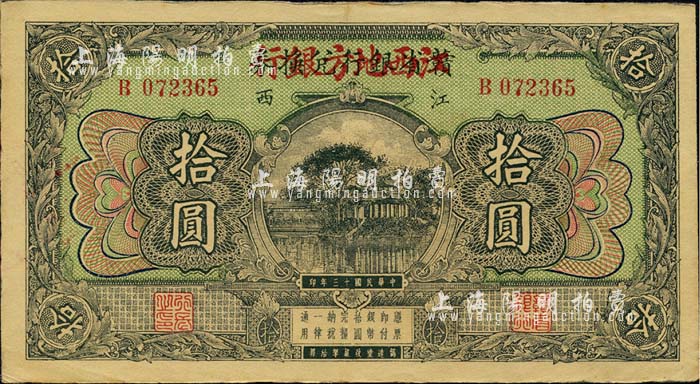 民国十三年(1924年)赣省银行兑换券改江西地方银行拾圆,品相甚佳,近九成新