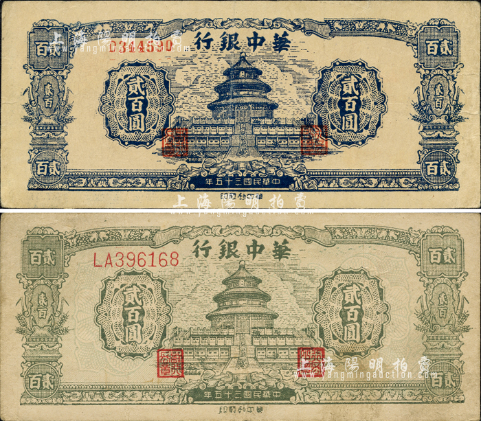 民国三十五年(1946年)华中银行贰百圆共2种不同,详分:蓝色天坛图(单字轨)、绿色天坛图(前双字轨);江南小有怡轩藏品,八成新
