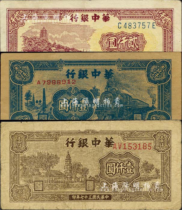 民国三十七年(1948年)华中银行蓝色火车图壹仟圆、棕色塔图壹仟圆、棕色六和塔图贰仟圆共3枚不同,江南小有怡轩藏品,七至八成新