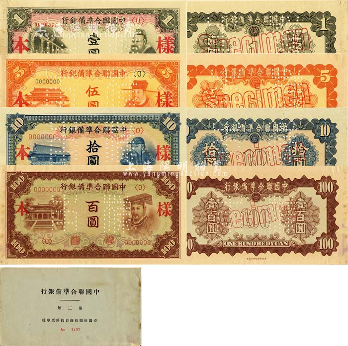 《中国联合准备银行第三版钞票印样》样本1册,内含:大殿孔子图壹圆、大殿岳飞图伍圆、大殿关羽图拾圆、棕大殿右帝百圆样本4全,正背共8枚;海外藏家出品,少见,九八成新