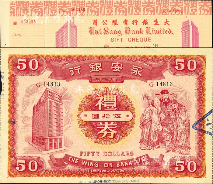 香港银行礼券2种,详分:永安银行有限公司礼券港币伍拾圆,上印银行、三星图;大生银行有限公司礼券港币未填用,附存根;森本勇先生藏品,九至九五成新