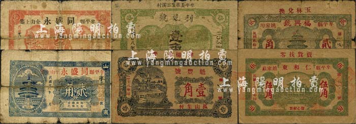 民国二十八年(1939年)牟平县民间钞票6种,详分:福兴号贰角,魁丰号壹角,利民号壹角,仁和东伍角,同盛永壹角、贰角;森本勇先生藏品,其中3枚有贴补,六至八成新