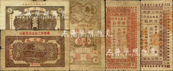 蓬莱县民间钞票5种,详分:增兴裕市洋叁分、伍分,福顺成1935年叁角,瑞升福1938年壹角;(长山岛)福德厚1938年壹角,该岛原属蓬莱县,至1956年改为长岛县;森本勇先生藏品,七至七五成新