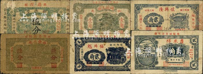 掖县民间钞票6种,详分:荣丰工厂1935年陆分、恒兴隆1937年贰角、吉来祥1937年贰角、福升魁1938年贰角、明德堂1938年伍分、同盛工厂1938年壹角;森本勇先生藏品,六至七五成新