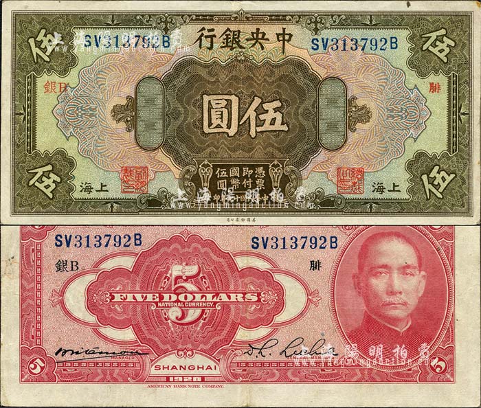 民国十七年(1928年)中央银行伍圆,上海地名,前双后单字轨,李觉·席德懋签名,加印领券“银B·腓”字;森本勇先生藏品,已属较佳品相,八成新