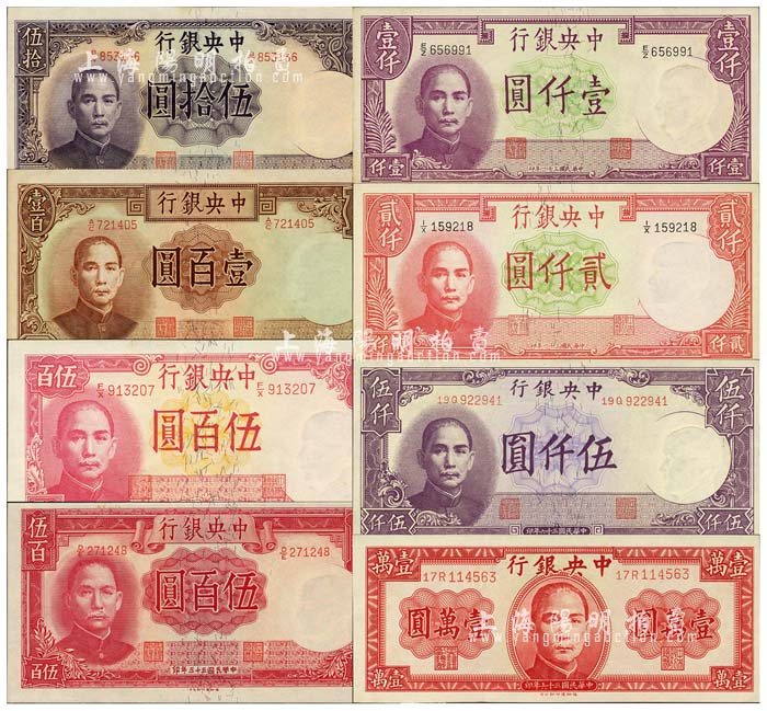 中央银行德纳罗版法币共8种不同,详分:1942年伍百圆、壹仟圆、贰仟圆,1944年伍拾圆、壹百圆、伍百圆,1947年伍仟圆、壹万圆;森本勇先生藏品,九八至全新