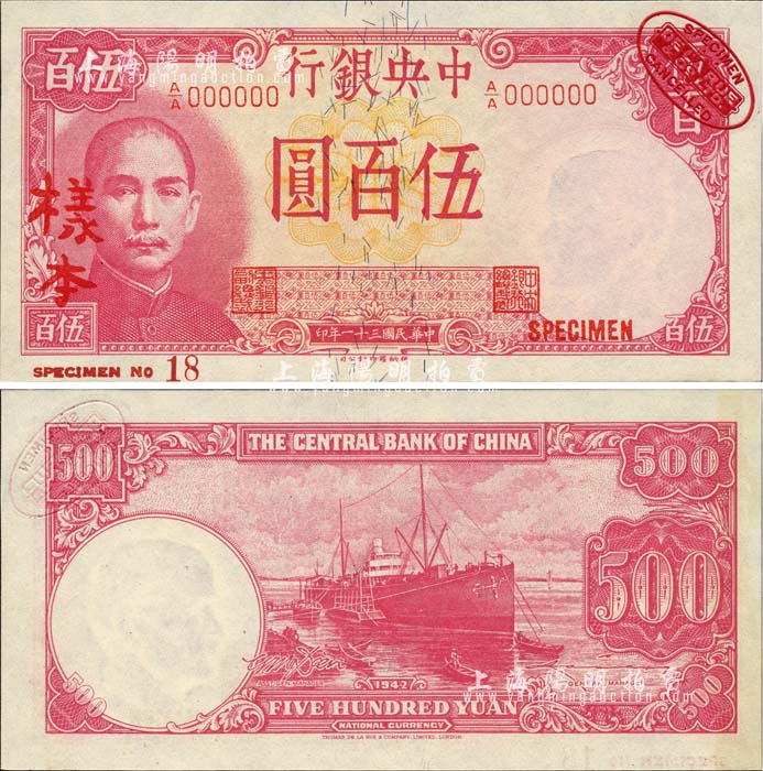 民国三十一年(1942年)中央银行德纳罗版伍百圆样本券,右上角印有英国德纳罗印钞厂红色标志;森本勇先生藏品,源于日本前辈名家末次节雄之旧藏,全新