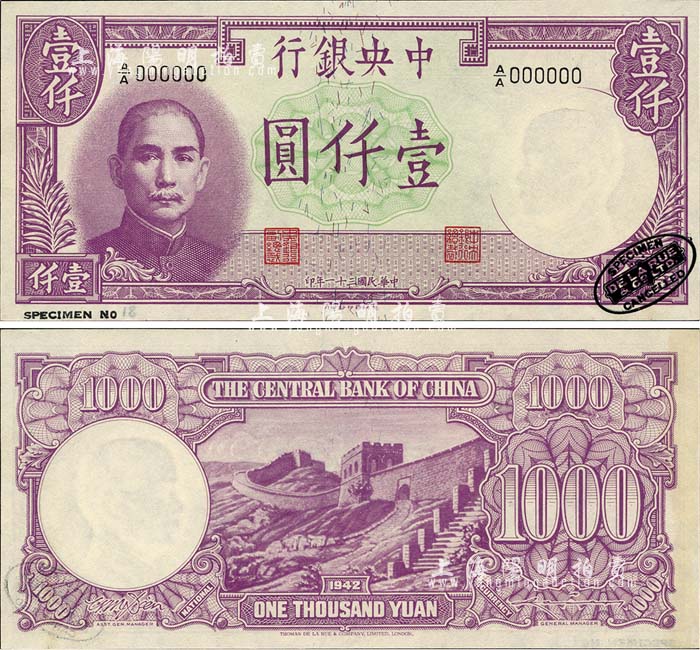 民国三十一年(1942年)中央银行德纳罗版壹仟圆样本券,右下角印有英国德纳罗印钞厂黑色标志;森本勇先生藏品,源于日本前辈名家末次节雄之旧藏,全新