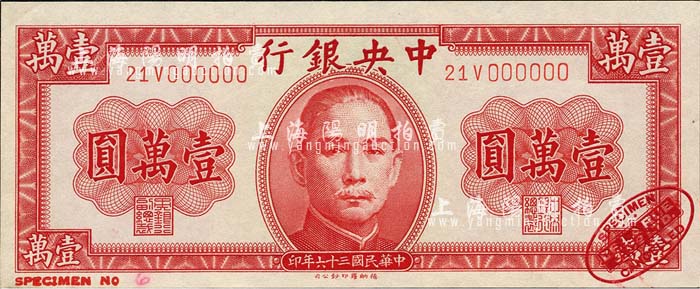 民国三十六年(1947年)中央银行德纳罗版壹万圆样本券,右下角印有英国德纳罗印钞厂红色标志;森本勇先生藏品,源于日本前辈名家末次节雄之旧藏,九八成新