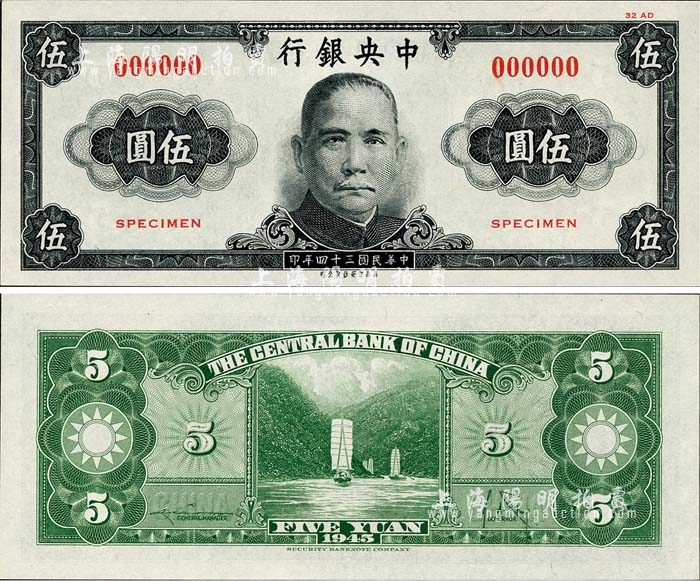 民国三十四年(1945年)中央银行美商保安版伍圆试色样本券,正面黑色/背面绿色印刷(正票为蓝色);森本勇先生藏品,少见,全新