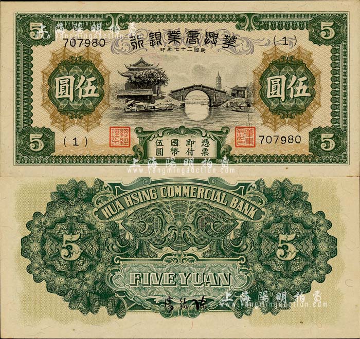 民国二十七年(1938年)华兴商业银行伍圆,日伪维新政府梁鸿志氏发行;森本勇先生藏品,九八成新