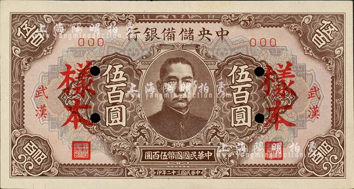 民国三十二年(1943年)中央储备银行伍百圆样本,长框短号券,“武汉”地名;森本勇先生藏品,九五成新