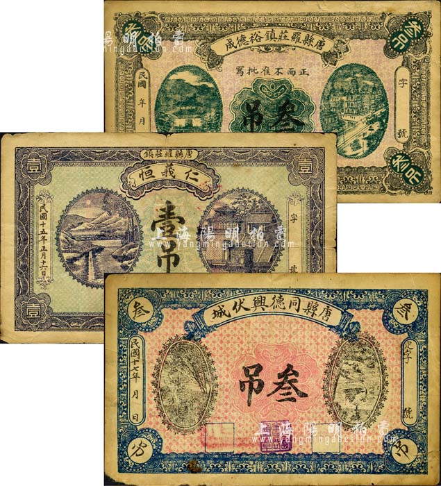 直隶唐县钱票3种,详分:唐县罗庄镇裕德成叁吊、仁义恒1926年壹吊、唐县伏城同德兴1928年叁吊;森本勇先生藏品,其中1枚有修补,七至七五成新