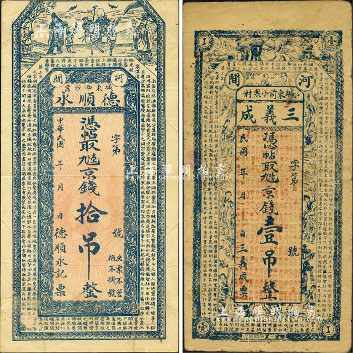 直隶河间县钱票2种,详分:德顺永·京钱拾吊,上印福禄寿三星和唐代王勃《滕王阁序》;三义成·京钱壹吊,上印金陵十二钗、博古图和《滕王阁序》古文;森本勇先生藏品,七五成新