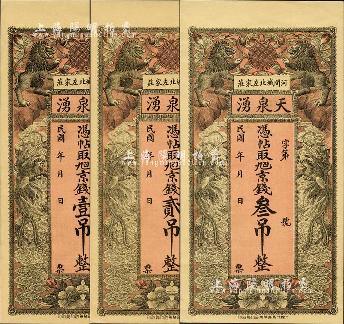 民国年(河间)天泉湧·凭帖取九四京钱壹吊、贰吊、叁吊共3枚全套,均上印双狮、双凤图,背印双龙仙境和高山流水图,形制美观;森本勇先生藏品,九八成新