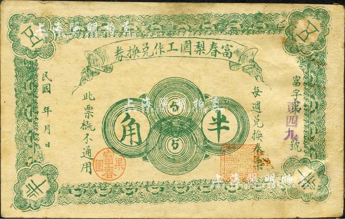 民国年·富春梨园工作兑换券半角,背面戳记上有“正黄旗村”地名,属吉林滨江双城县民间钞票(今归黑龙江辖);森本勇先生藏品,源于日本前辈名家片冈裕(汤岛)之旧藏,少见,八成新