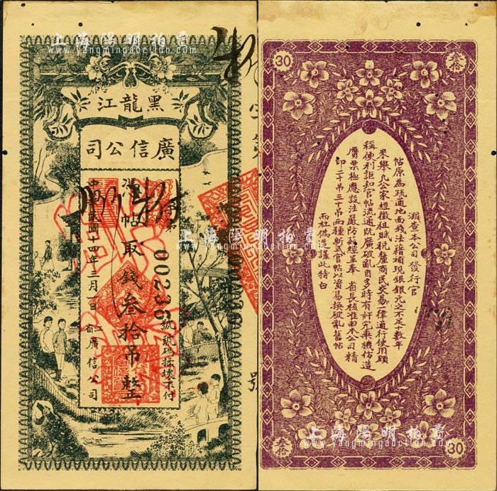 民国十四年(1925年)黑龙江广信公司叁拾吊,正票改作票样;森本勇先生藏品,有小蛀孔,未折九成新