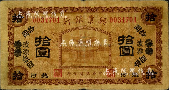 民国九年(1920年)热河兴业银行棕色拾圆,天津改凌源地名,森本勇先生藏品,七成新