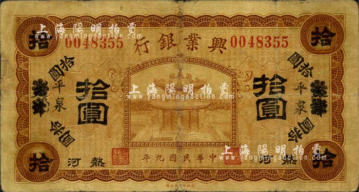 民国九年(1920年)热河兴业银行棕色拾圆,天津改平泉地名,森本勇先生藏品,六五成新