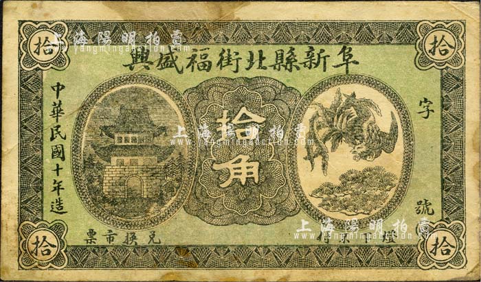 民国十年(1921年)阜新县北街福盛兴拾角,上印城楼及单凤图;森本勇先生藏品,少见,七五成新