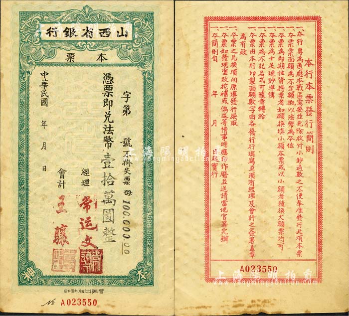 民国年·山西省银行本票法币壹拾万圆,背印发行简则,但其上面额等似为后盖;森本勇先生藏品,八五成新