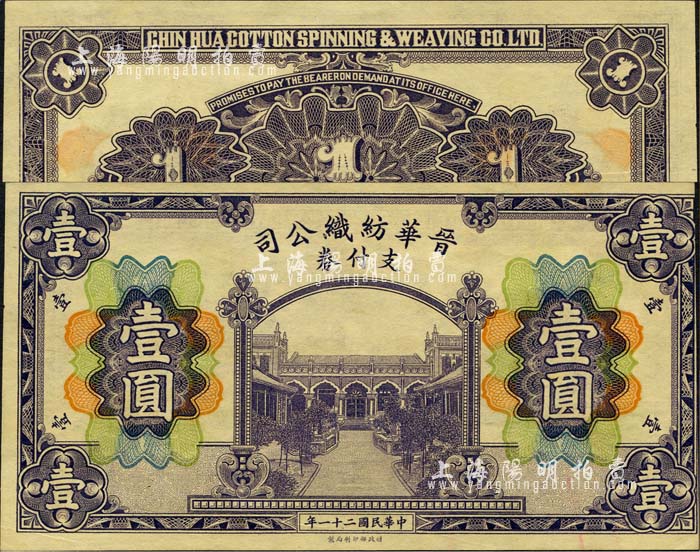 民国二十一年(1932年)晋华纺织公司支付券壹圆,财政部印刷局印制;该公司为山西著名企业,由阎锡山老丈人徐一清(曾任山西省银行总理)等所创办;森本勇先生藏品,九五成新